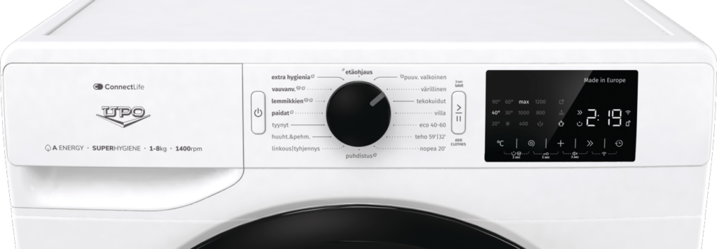 Helppokäyttöinen: pesukone vain päälle, valitse ohjelma sekä paina käynnistyspainiketta. Haluamasi lisäasetukset saat kätevästi valittua suurelta kosketusnäytöltä.