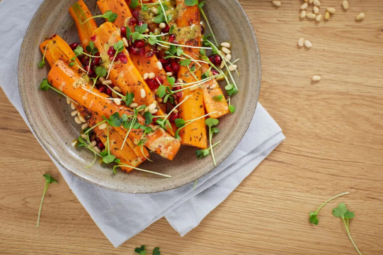 Kuori porkkanat ja pilko ne pystysuunnassa oman mieltymyksesi mukaan. Mausta Provenssinyrteillä, suolalla ja pippurilla ja voitele lopuksi oliiviöljyllä. Aseta leivinpaperille ja paista 20-30 minuuttia esilämmittetyssä UPO-uunissa AirFry-ohjelmalla* tai kuullota paistinpannulla, kunnes porkkanat ovat saaneet hieman väriä. Valmista sen jälkeen kastike yhdistämällä hunaja, sinappi, suola, pippuri ja omenaviinietikka. Sekoita huolellisesti. Kaada seos paahdettujen porkkanoiden päälle ja lisää pinjansiemeniä, granaattiomenan siemenet ja tuoreet yrtit.